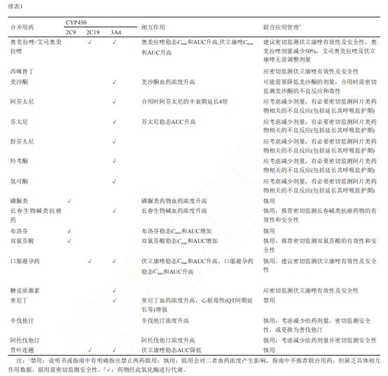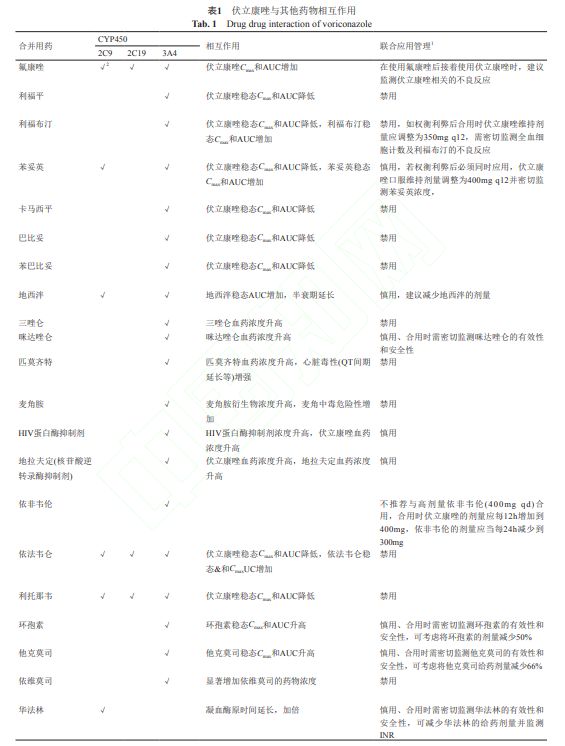 伏立康唑经CYP2C19、CYP3A4和CYP2C9代谢,同时也是这3种酶的抑制剂[18],而人体内约有40%的药物也是通过这几种酶代谢的,对酶的产生的诱导或抑制作用都会对伏立康唑的血药浓度产生影响。真菌感染的患者往往同时患有其他基础疾病,如糖尿病、器官移植、自身免疫性疾病等,一些老年患者还同时患有高血压、心脑血管疾病等,在使用伏立康唑治疗的同时还需服用免疫抑制剂、激素、降糖药、抗高血压药等等,这些药物大都影响伏立康唑的代谢,而伏立康唑的酶抑制作用也会影响一些药物的浓度。伏立康唑说明书和一些指南中对药物相互作用的情况进行了说明和推荐[5,18-23],见表1。这些相互作用十分复杂,且除了通过CYP450同工酶相互影响外,伏立康唑还会影响尿苷二磷酸葡萄糖醛酸转移酶活性及药物转运体P糖蛋白表达,进而与其他药物产生相互作用[19]。但目前这些药物之间常常缺乏具体剂量调整的建议,这也提示我们需要进行伏立康唑的血药浓度监测实现个体化给药。
