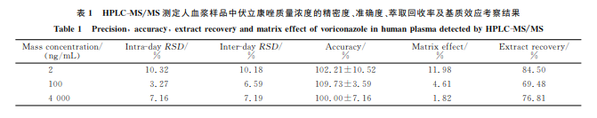 伏立康唑血浆质控样品萃取回收率考察结果见表1。可知低、中、高质量浓度伏立康唑的萃取回收率均>50%,考察结果合格。