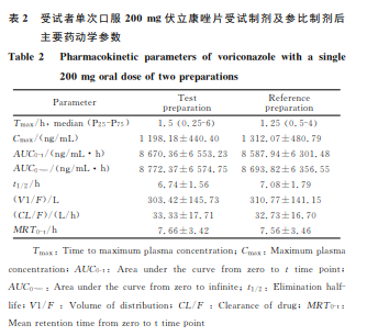 采用 PhoenixTM WinNonlin○R 6.1软件拟合受试者单次空腹口服伏立康唑片受试制剂与参比制剂的药动学参数,并进行生物等效性的统计分析。受试制剂和参比制剂的药动学参数峰浓度(Cmax)、药时曲线下面积(AUC0-t、AUC0-∞ )经对数转换后,进行双单侧t检验,以90%置信区间法进行生物等效性评价,等效区间为80.00%~125.00%。达峰时间(Tmax)进行非参数检验(Wilcoxon秩和检验)。α=0.05。