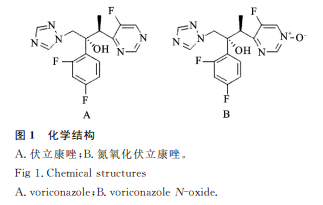 伏立康唑是一种二代三唑类抗真菌药物,对曲霉菌、假丝酵母菌和镰刀菌具有广谱抗真菌作用,广泛应用于预防和治疗真菌感染[1-2];伏立康唑主 要 经 细胞色素 P450酶CYP2C19代谢,少量经 CYP3A4和CYP2C9代谢[3-4],主要代谢产物是氮氧化伏立康唑,占人体内所有代谢产物的72%[5]。伏立康唑和氮氧化伏立康唑的化学结构见图1。在个体间,伏立康唑具有显著的非线性药物动力学差异[6],这种差异与细胞色素 P450酶的基因多态性、药物间的相互作用和肝功等有关[7-9]。为了研究伏立康唑和氮氧化伏立康唑的药物动力学特征,需建立一种简单、灵敏的分析方法。